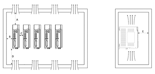 并排安裝時,橫向兩側(cè)建議各留 30mm 以上間距V1規(guī)格,無風(fēng)扇結(jié)構(gòu),采用側(cè)面散熱片進(jìn)行散熱,因此必須留有30mm的間隙)。首尾兩臺驅(qū)動器與柜體側(cè)面之間,至少留有 50mm 間隙。